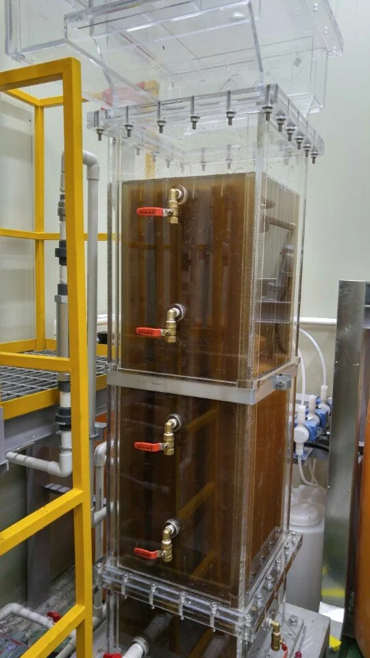 2016년 2월, 20L의 AMX 균을 300L 배양조에 재 배양한 것을 기점으로 1년 반 동안 300L 2기, 900L 1기, 900L 4기까지 AMX 배양조의 스케일업(scale-up)을 진행했습니다. 이와 동시에 lab AMX 반응기에서도 1L 반응기를 시작으로, 15L, 50L, 2개의 300L 반응기, 4개의 500L 반응기까지 수많은 scale-up을 진행했습니다. 그리고 2018년에는 Pilot과 lab에서 배양되고 있는 모든 AMX 미생물을 200m3/d 규모의 대량배양조로 스케일업을 진행했습니다. 반응조 사이즈만 64m3로 국내 최대 규모의 AMX 배양조입니다. 현재 연구팀은 2018년 말, 부산 강변에 70m3/d급 대량배양조를 추가로 설치하고 국내에서만 모두 2곳에서 AMX 대량 배양조를 운영하고 있습니다.