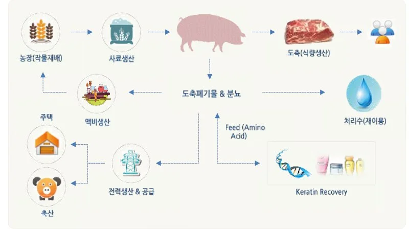 최근 축산업계에서는 AI 기술을 접목한 가축사육이 주목받고 있습니다. 하지만 누구도 거기에서 발생되 는 가축분뇨의 처리에 대해서는 고민하지 못하고 있어요. 우선 가축분뇨는 고농도의 유기물을 포함하고 있어서 혐기소화를 통해 메탄가스와 같은 에너지를 생산할 수 있습니다. 유기물을 제거한 질소와 인은 비료의 주성분이죠. 부숙된 퇴액비는 사료작물을 포함한 작물생산에 이용할 수 있고, 정화 처리된 방류수는 재이용이 가능합니다. 또, 도축시 발생하는 털이나 발톱 등과 같은 부산물을 이용해서 케라틴이나 아미노산과 같은 유효물질을 생산할 수 있어요. 부강테크는 이미 가축분뇨와 도축 부산물을 재활용하고 순환할 수 있는 기술들을 확보해 고도화하고 있고, ‘지속가능한 축산업 모델(Go Together Project)’은 이러한 다양한 솔루션과 프로세스를 기반으로 개발됐습니다.