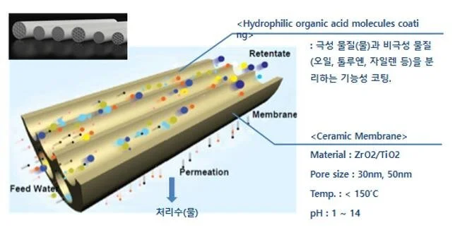 MoF 막은 다공성 세라믹 막으로 세라믹 막 내부에 물과 오일을 분리하는 Hydrophilic organic acid molecules coating 처리가 되어 있다. 유입수는 MoF 막의 작은 유입홀로 유입되고, 유분이 제거된 처리수는 MoF막 외부로 배출되며, 처리수가 배출된 나머지 유분과 SS오염물질들은 유입홀을 따라 이동하여 뒤쪽 홀로 배출된다.