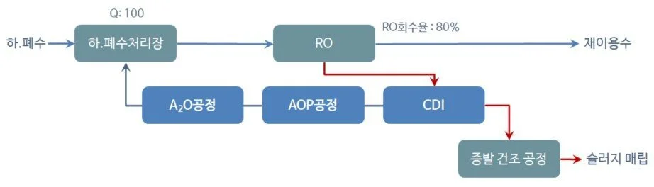 CDI(Capacitive Deionization)를 통해 TDS(Total Dissolved Solids)를 제거한 후 난분해성 물질과 질소 제거를 위해 AOP(Advanced Oxidation Process)공정과 A2O(Anaerobic Anoxic Oxic Process)공정을 추가하여 시설비가 상승하였으며, 과불화화합물*은 AOP공정을 구성하더라도 제거가 불가능하였다.
