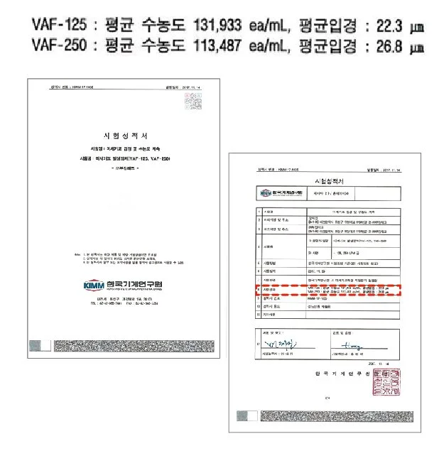 최근 부강테크가 한국인정기구(KOLAS)에서 vDAF의 기포 계측을 진행한 결과, 크기는 평균 입경 30㎛ 이하, 기포 수 농도는 최대 131,933개/ml로 확인되었다. 이는 일반적으로 10,000개/ml 내외의 기포 수 농도를 가지는 DAF 기술 대비 약 13배에 이르는 수치이다.
