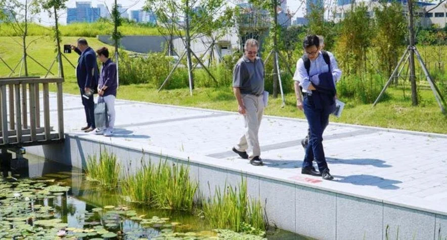 서울 중랑물재생센터 위에 자리잡은 공원에서 산책을 즐기는 시민들