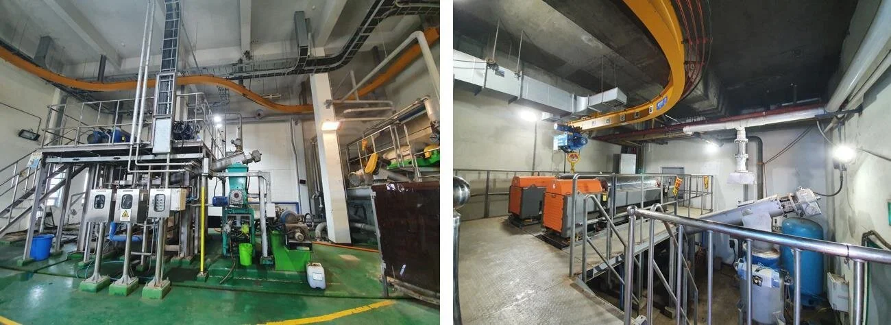 오딘이 적용된 강화가축분뇨공공처리시설 내 전처리동 협잡물 처리기(좌) 및 탈수기동(우)
