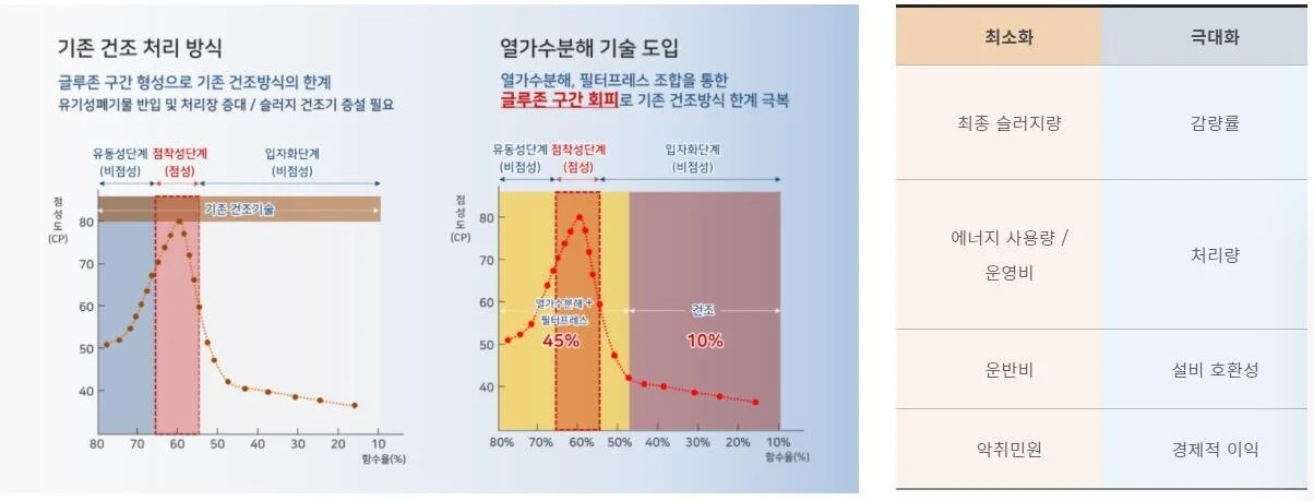 현재 슬러지 감량화에는 대부분 단독 건조 및 소각 기술이 이용되고 있다. 하지만 높은 에너지 비용과 가동 효율 저하, 악취로 인한 2차 환경오염이 사회적으로 이슈가 되고 있다.