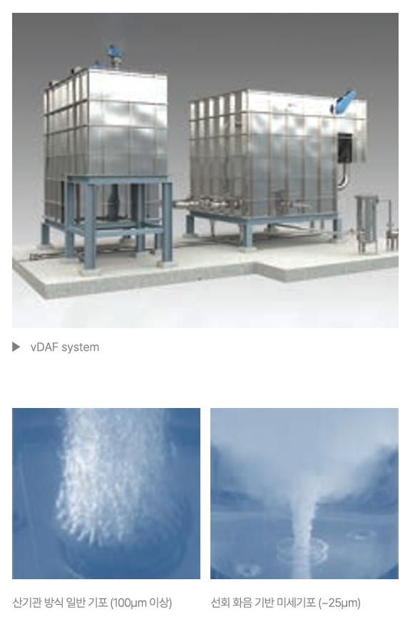 부강테크의 vDAF(Vortex DAF)는 기존 DAF 기술의 한계를 개선하고 성능을 획기적으로 향상시킨 차세대 수처리 기술이다.
