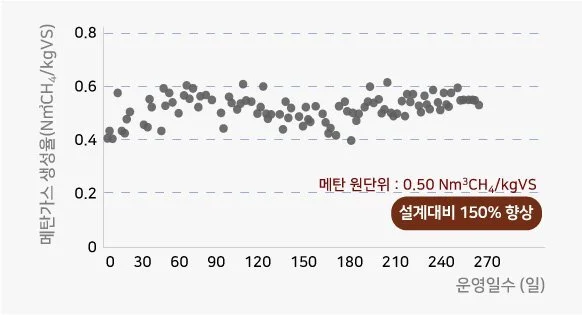 - 소화 효율 향상 : 고형물 체류시간 확보로 가스 생산량 증대 및 안정적인 VS 제거율 구현